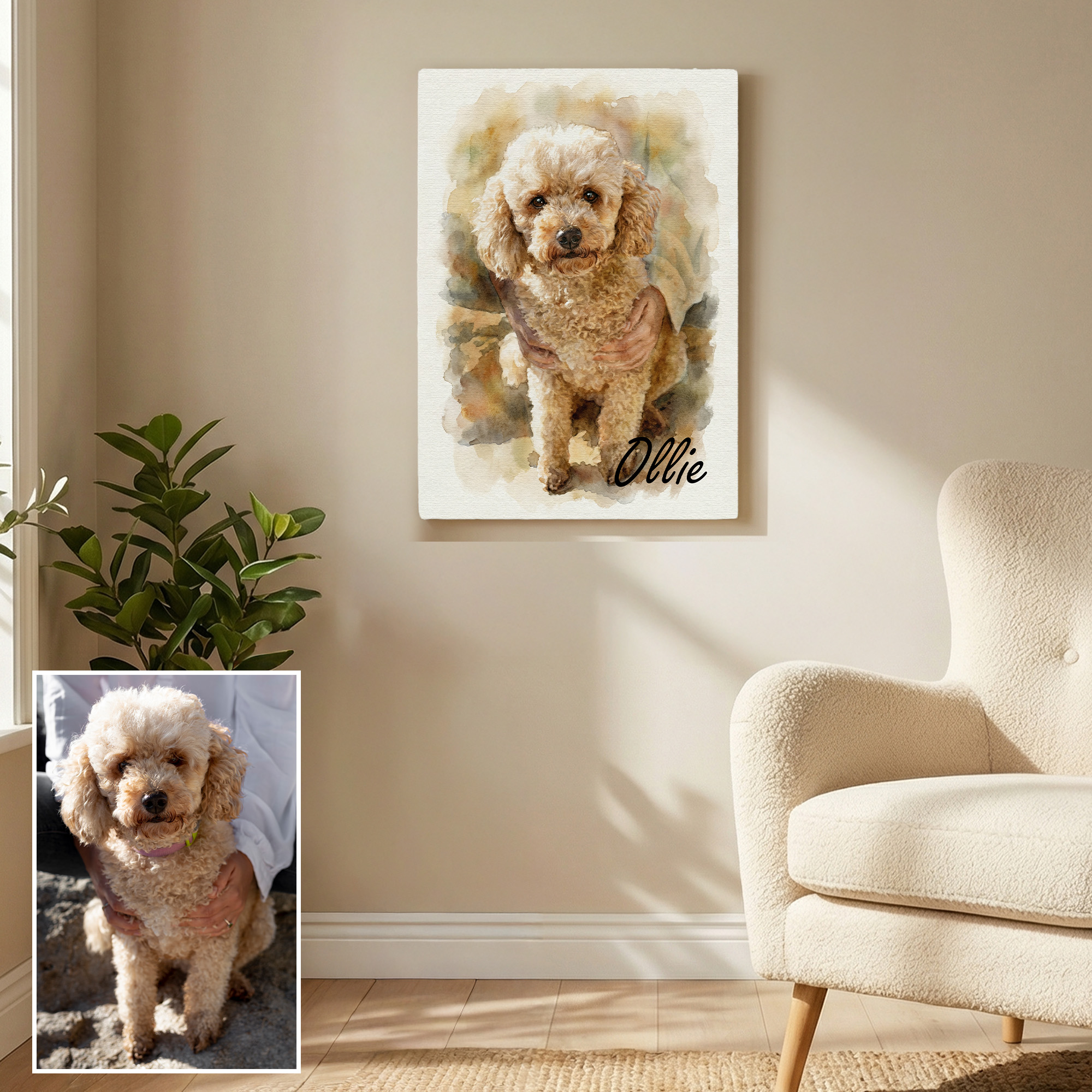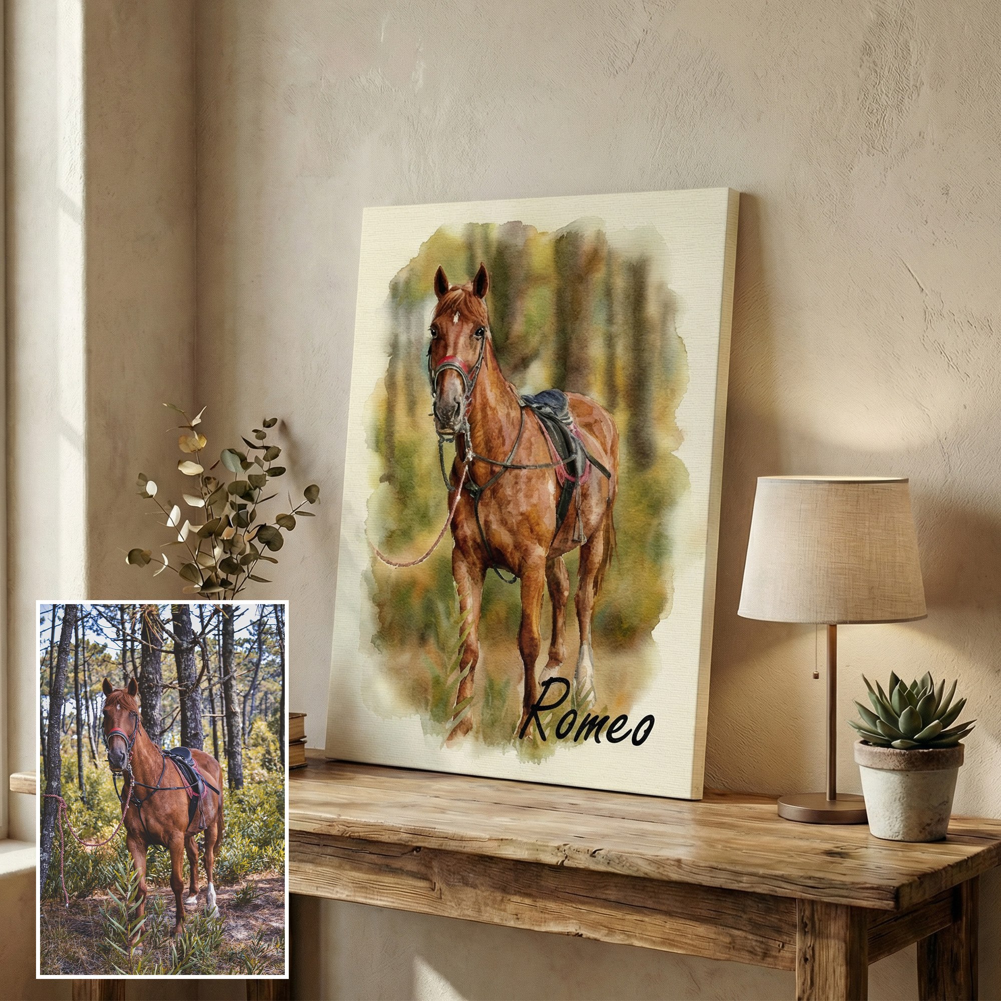 Watercolor Pet Portrait - This custom canvas painting turns your favorite photo into a gentle watercolor pet portrait filled with warmth and detail. The soft brush style captures your dog, cat, horse, or beloved pet in an exquisite and unique way. Whether displayed as wall art or a canvas poster, it brings comfort, love, and personality into any space.
