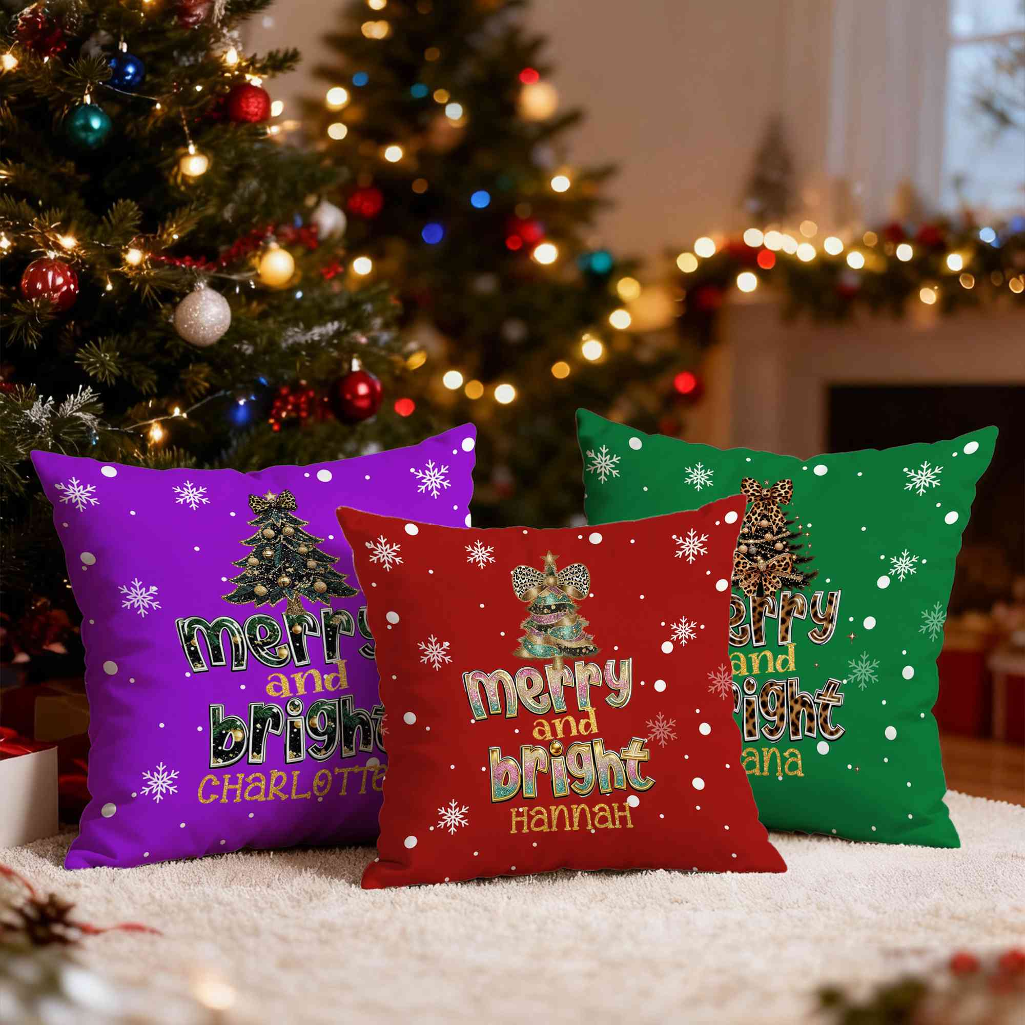 Personalized Name Bow Christmas Tree Merry and Bright Throw Pillow Cover with Leopard Prints, Home Decor, Christmas Gift for Girls/Family/Friends
