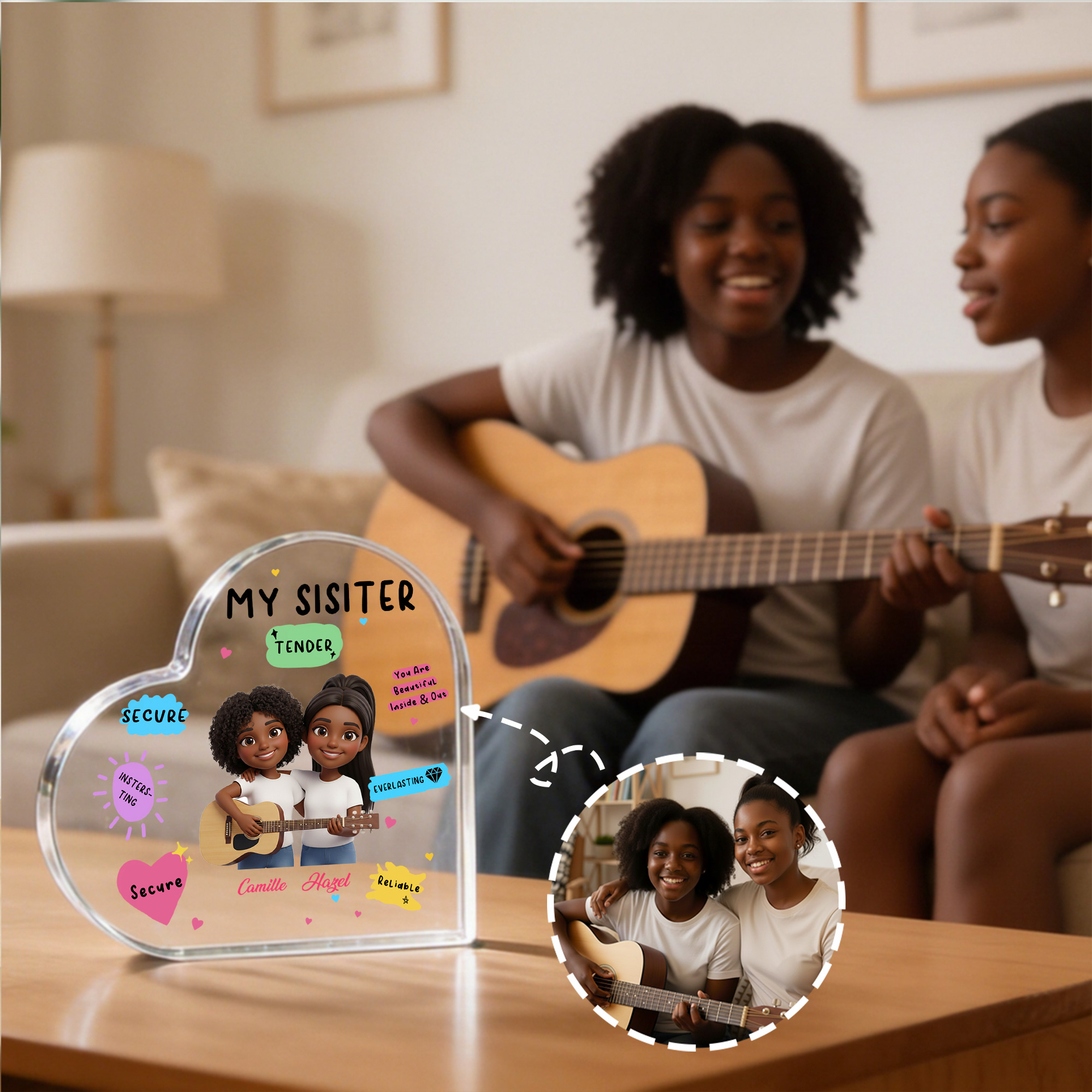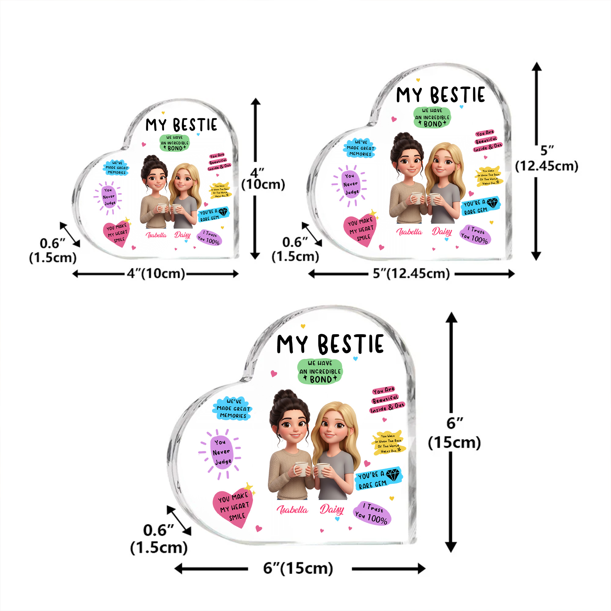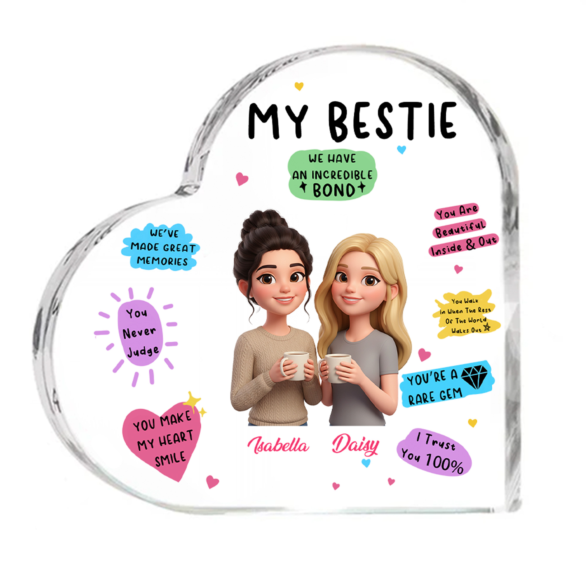 Heartfelt Cartoon Design - This heart-shaped acrylic plaque turns your favorite photo into a colorful cartoon-style portrait of you and your bestie. The adorable character illustration and sweet words captures your friendship in a playful and lively way. The heart shape stands for love, loyalty, and the special bond you share, making it a sweet symbol of “Besties Forever” for your desk or shelf.